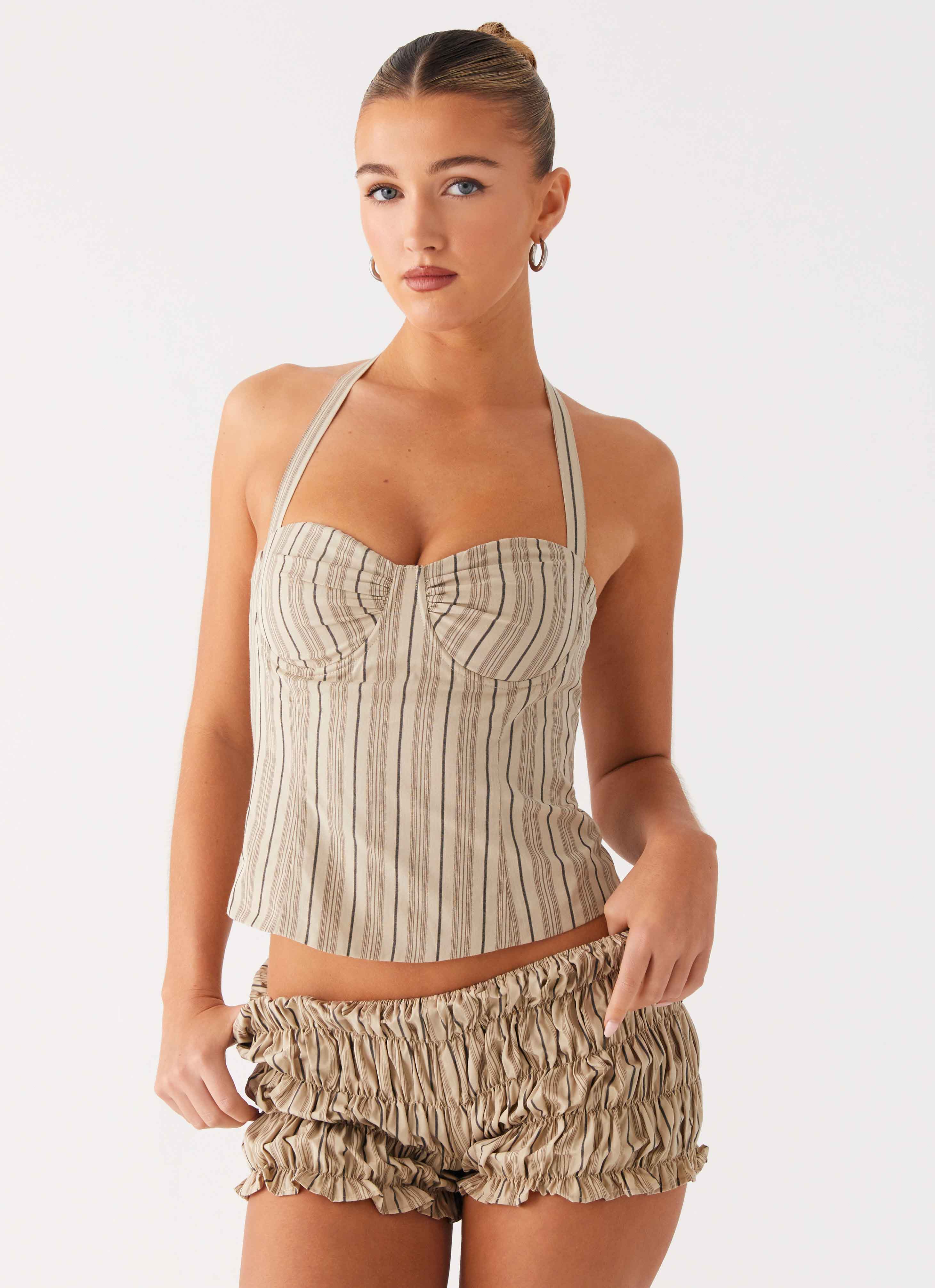 The Cheryl Bustier Halter Top in oatmeal stripe brings a playful twist to a structured silhouette. Featuring a sweetheart neckline and a soft neck tie strap. it's designed to flatter while keeping things fun. Perfect for sunshine days that lead into starry nights.