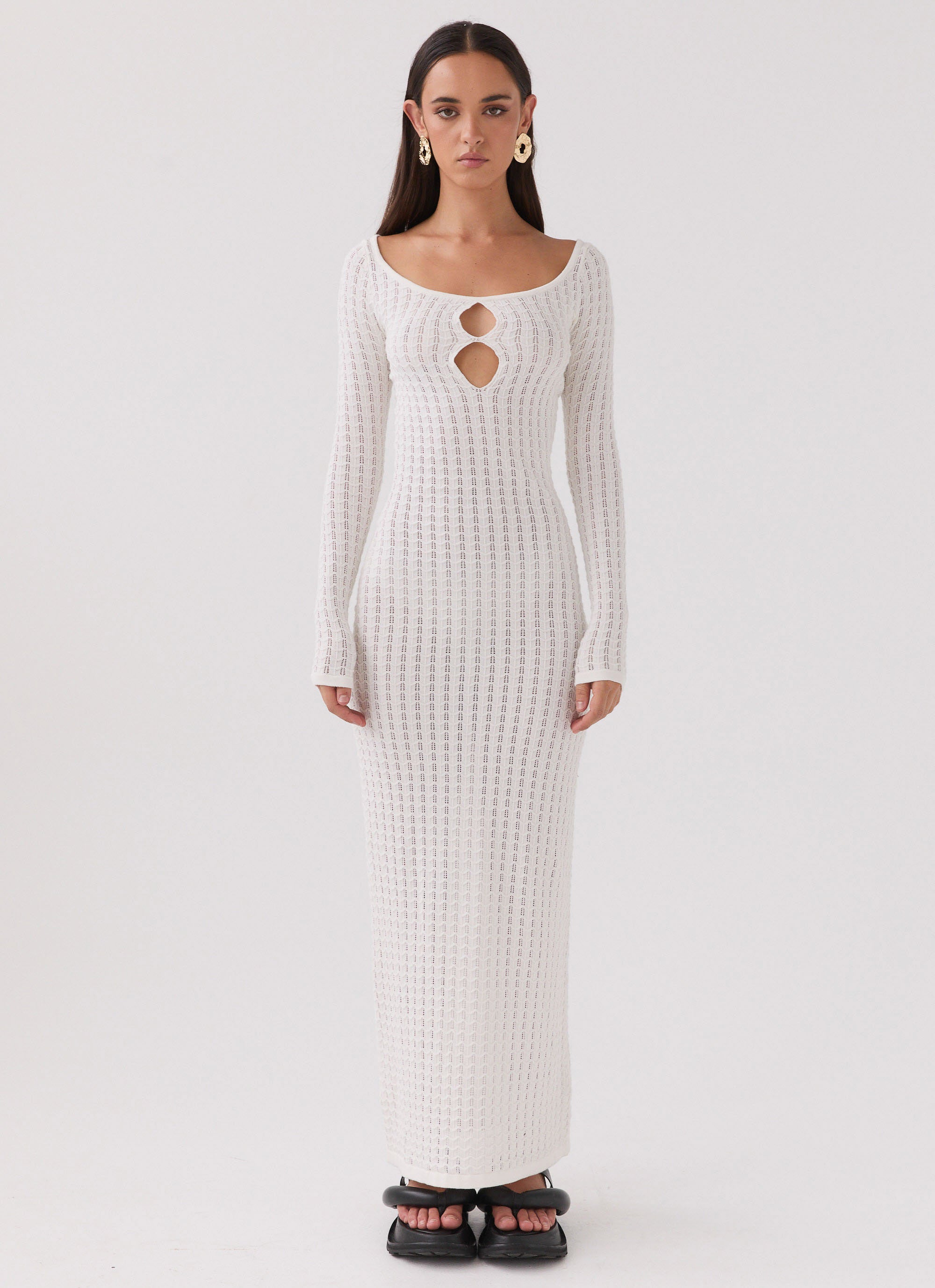 Introducing our Crystal Cascade Knit Maxi Dress. crafted for those who thrive in the PM glow. With its fitted style and keyhole cutout. this dress exudes elegance and allure. Perfect for embracing golden skies. balmy nights. and the sleek silhouettes of nightclub scenes.